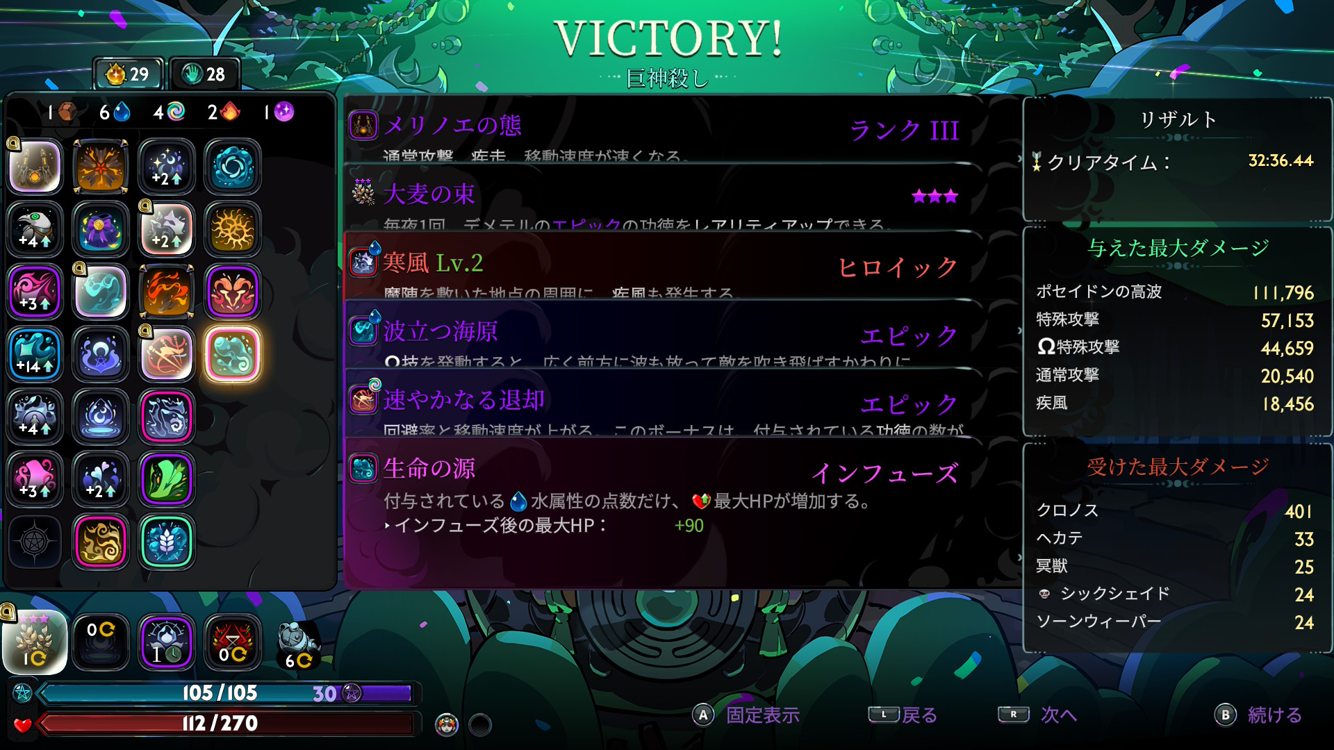 写真は40ラン目を超えたあたりで、やっと初めての地下ルートのラスボス討伐に成功したリザルト画面。ここまで来ないとリザルト画面すら出ないので、初めてリザルト画面を見た瞬間でもあった。