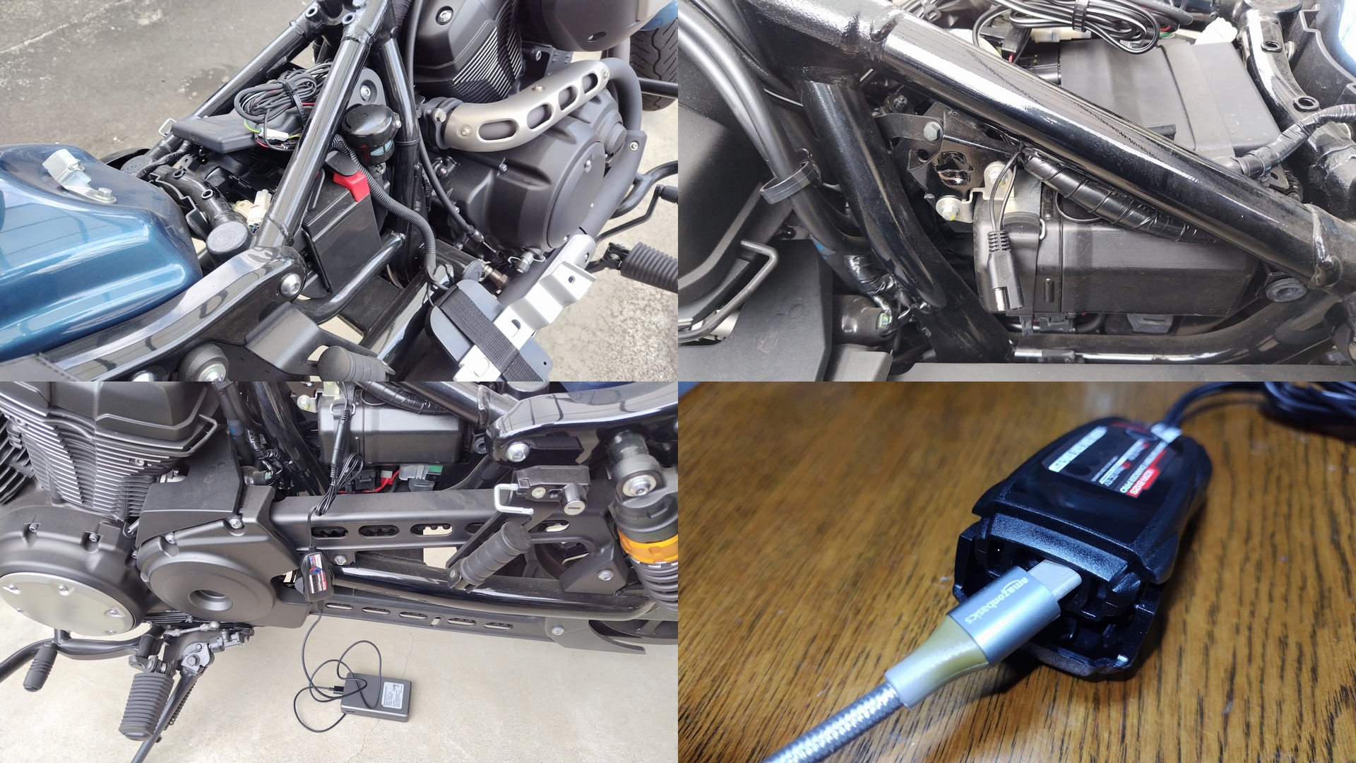 で、バッテリーの端子のボルトに、アダプターの圧着端子を共締めして、サイドカバー側に少しだけアダプターが出るように調整して、外したものを装着しなおせば作業は完了だ。